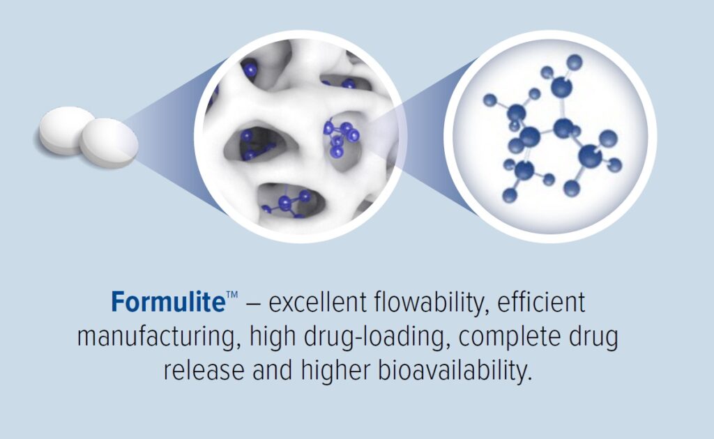Unlike traditional amorphous solid dispersions, Formulite is a polymer free technology based on mesoporous magnesium carbonate. Loading of the drug inside the nanoporous matrix ensures long-term amorphous stability. Formulite supports a broad range of compounds and enables high drug loading in the finished product.